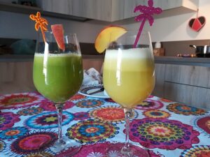 A sinistra un estratto di cetriolo, sedano, basilico e limone